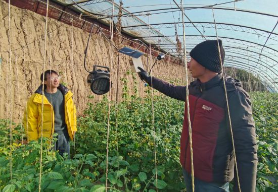 “在农技人员提醒下,我们早早就把日光温室加热器调试好了。只要棚内温度低于6摄氏度,加热器就会自动启动,晚上降温也不怕。”保建国用手指敲着一个像音箱一样的设备说。说话间,温室里的气温在阳光照射下不断攀升,20分钟左右就达到了16摄氏度。