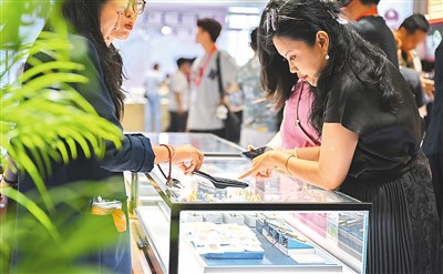 日前,消费者在消博会上选购黄金首饰。